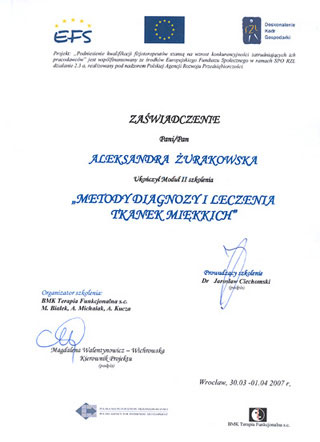 - podstawowy i rozwijający kurs PNF zakończony egzaminem,